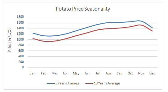 The chart above depicts the potato price seasonality. Prices normally starts rising from June onward and are firm till October. Prices start coming down from November as fresh crop from Punjab starts coming in markets and in few regions stock ofrabi crop is still available in cold storages. After Punjab, fresh crop from U.P followed by West Bengal, Bihar and Gujarat starts coming into the market. Fresh crop is available in the market till May and after that cold store potato is consumed. Smaller quantity of fresh potato from the hilly states of Himachal Pradesh and Uttarakhand comes to the market during June to October but their prices are high compared to the cold store potato. |
