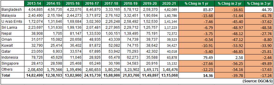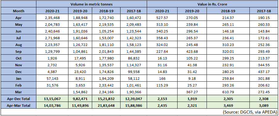 The table above depicts the onion production in major onion-growing countries. China is the largest onion producing country closely followed by India at second position. China’s production approached 24 million tons in 2018-19 while India’s production in the same year was around 22.07 million tons. Egypt, USA, Iran, Turkey, Russia and Pakistan are the other major producing countries. |