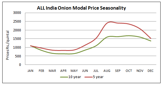 Onion prices starts moving upward from July because rabi crop arrivals have ended by this time and the country completely relies on rabistocks till September. Prices start coming down in October as fresh kharif and late kharif crop starts arriving in the market from Maharashtra and Karnataka. In August–September,a smaller quantity of crop also comes from Andhra Pradesh and plays a significant role in controlling the high prices. Thus any damage to the onion crop in Andhra Pradesh or lower production in Andhra Pradesh could result into uncomfortably high prices during August to September. |